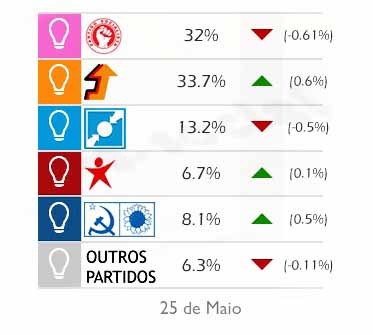 Nunca sei o que é uma descida muito menos uma subida nesta questão de sondagens. Quem parece dominar a matéria na ponta da unha é Rodrigo Guedes de Carvalho pivot da SIC no jornal nacional. Para ele descida é o PS e CDS apresentarem menos 0,6% e 0,5% respectiva-mente, enquanto subida é o PSD apresentar mais 0,6%. Já "subida ligeiríssima" é a CDU apresentar mais 0,5%. Dito assim com esta clareza por Rodrigo Guedes de Carvalho mais não me resta do que agradecer-lhe por me elucidar numa matéria a que geralmente sou avesso.